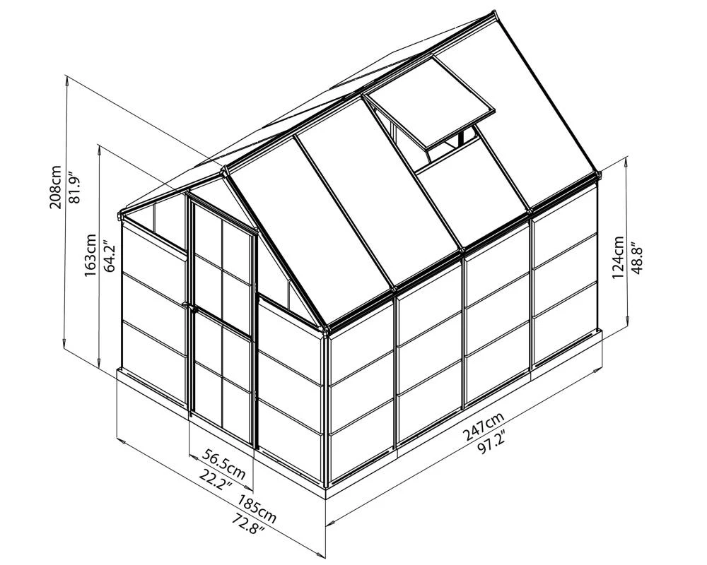 Die Polycarbonat-Paneele des Gewächshauses Hybrid laufen in Aluminiumrahmen und werden ohne zusätzliche Teile in den Profilen eingeschlossen. Das Gewächshaus hat eine verzinkte Stahlbasis und eine Flügeltür, zwei verschiedenen Arten von Polycarbonatplatten schaffen ein Gleichgewicht der Sonneneinstrahlung während des Tages. Inkl. Fundamentrahmen aus verzinktem Stahl.