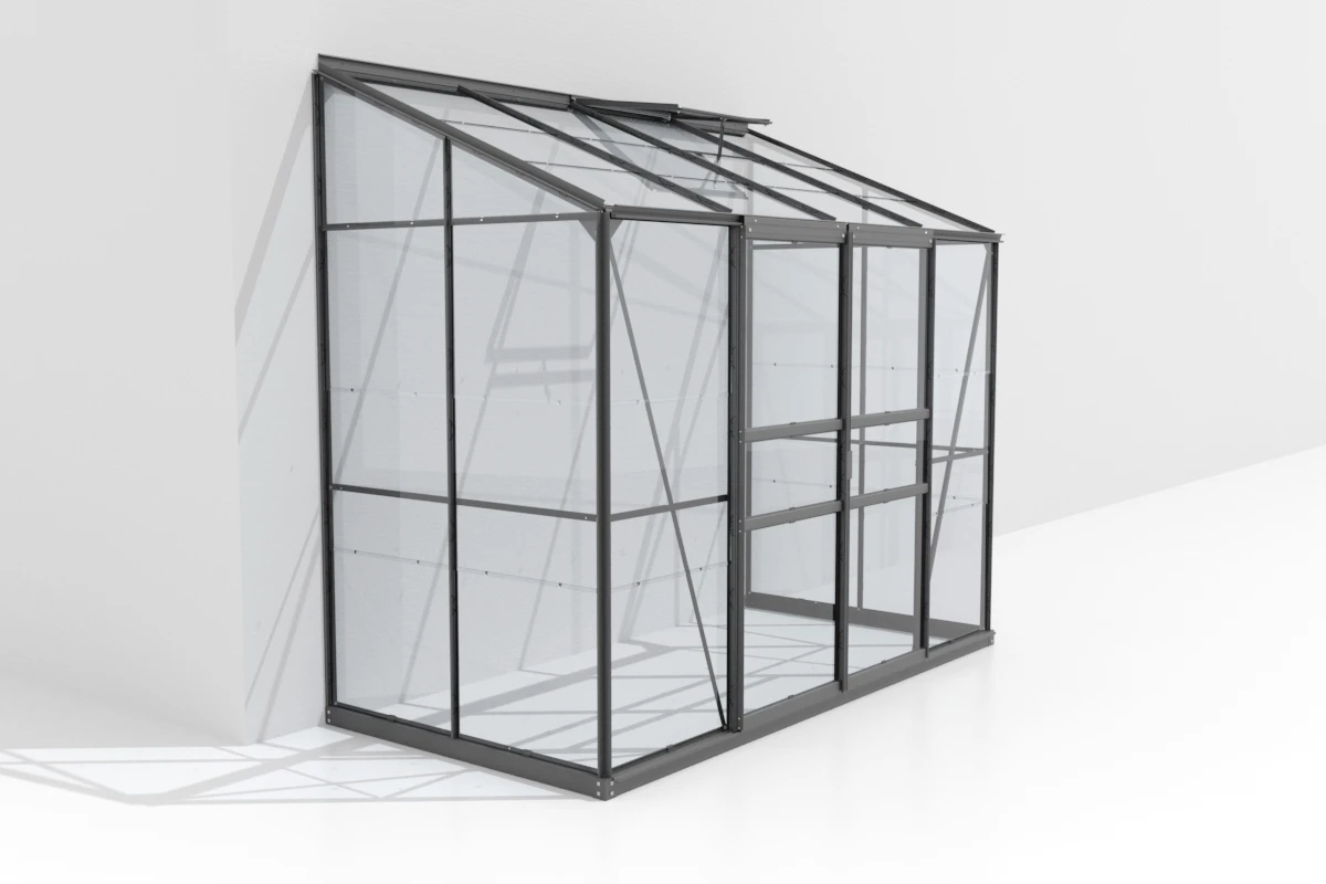 Mit Grundflächen ab 0,9 m² ermöglicht das Anlehnhaus Styx selbst auf kleinen Balkonen und Terrassen das Hobbygärtnern. Die hohe Schiebetür öffnet sich mühelos, sodass der direkte Zugriff auf das angebaute Gemüse im Gewächshaus gewährleistet ist. Das mitgelieferte Dachfenster bietet eine zusätzliche Belüftungsmöglichkeit. Die Styx Modelle werden wahlweise mit Hohlkammerplatten (HKP) in ca. 4 mm Stärke aus UV-stabilisiertem Polycarbonat oder mit ca. 3 mm starkem Sicherheitsglas, kristallklar (ESG) eingedeckt.