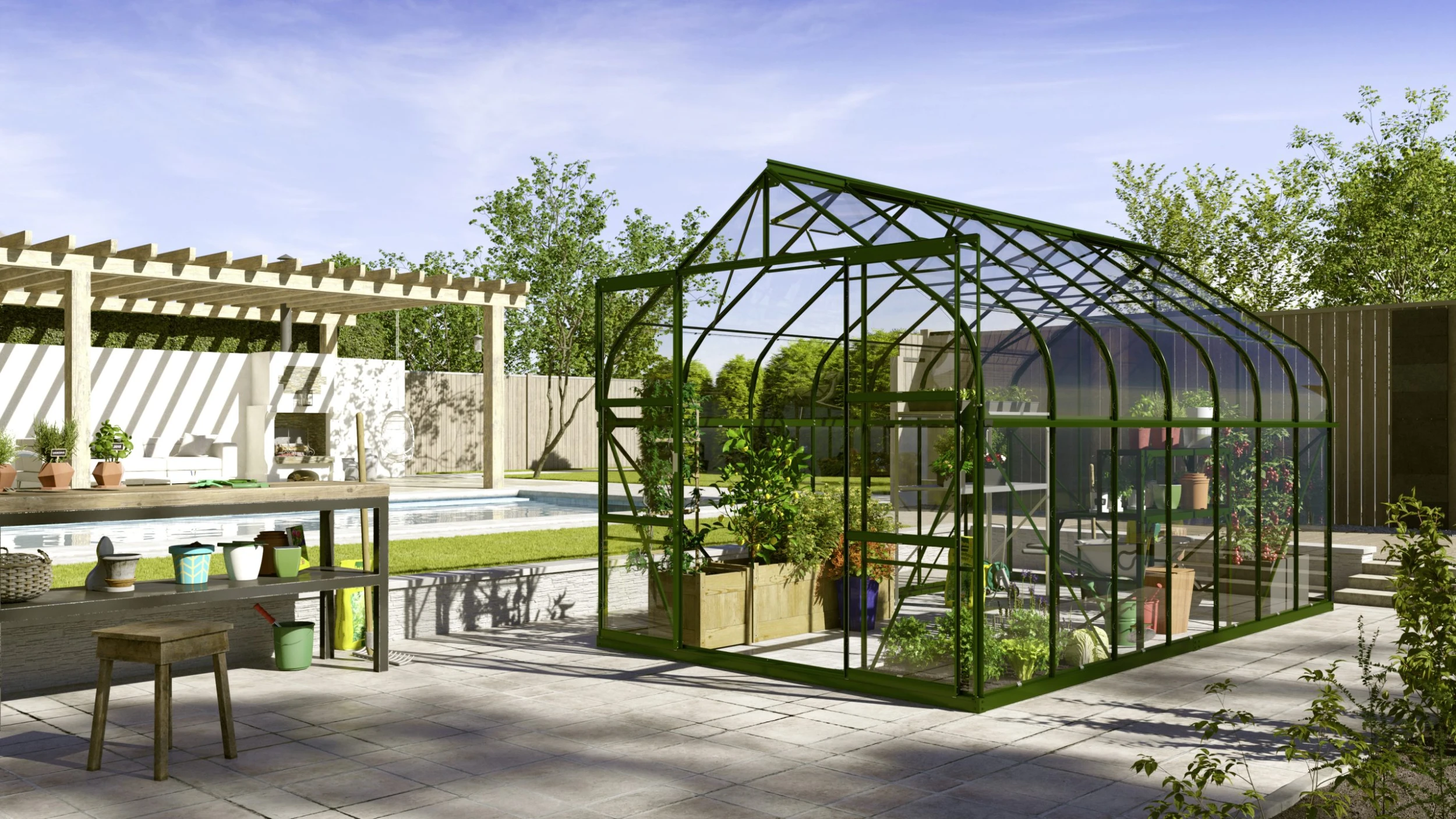 Ein Hauch von orientalischem Märchen weht durch das Dione und macht das Gewächshaus nicht nur für Ihre Pflanzen zu einem wunderbaren Ort. Das elegante, formschöne Aluminiumgewächshaus ist ein Schmuckstück für jeden Garten. Mit seinem seitlich abgerundeten Dach fügt es sich perfekt ins Landschaftsbild ein und sorgt das ganze Jahr für frische Kräuter, gesundes Gemüse und blühende Pflanzen. Es ist in fünf verschiedenen Größen mit den Grundflächen von 5 bis 11,5 m² und in drei Farben erhältlich: Aluminium eloxiert, Smaragd oder Schwarz (6700-11500) pulverbeschichtet. Verglast ist das Dione mit ca. 3 mm starkem Sicherheitsglas, kristallklar (ESG), die gebogenen Scheiben sind aus Polycarbonat. Sicherheitsglas, kristallklar (ESG) ist gehärtetes Glas, bricht daher nicht scharfkantig und sorgt somit für mehr Sicherheit. Durch die leichtgängige Doppelschiebetür mit einer Breite von 122 cm und einer Höhe von 200 cm ist das Dione bequem zu begehen. Für eine optimale Belüftung sorgen die im Lieferumfang enthaltenen Dachfenster. Je nach Modell sind es zwischen einem und vier Stück. Auch die Regenrinnen sind serienmäßig enthalten. Reichhaltiges Zubehör ist auch in den Farben Smaragd und Schwarz erhältlich. Um einen absolut ebenerdigen und rechtwinkligen Aufbau des Gewächshauses zu gewährleisten, ist ein Fundamentrahmen aus verzinktem und farbbeschichtetem Stahlblech besonders empfehlenswert und hilfreich.