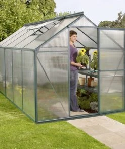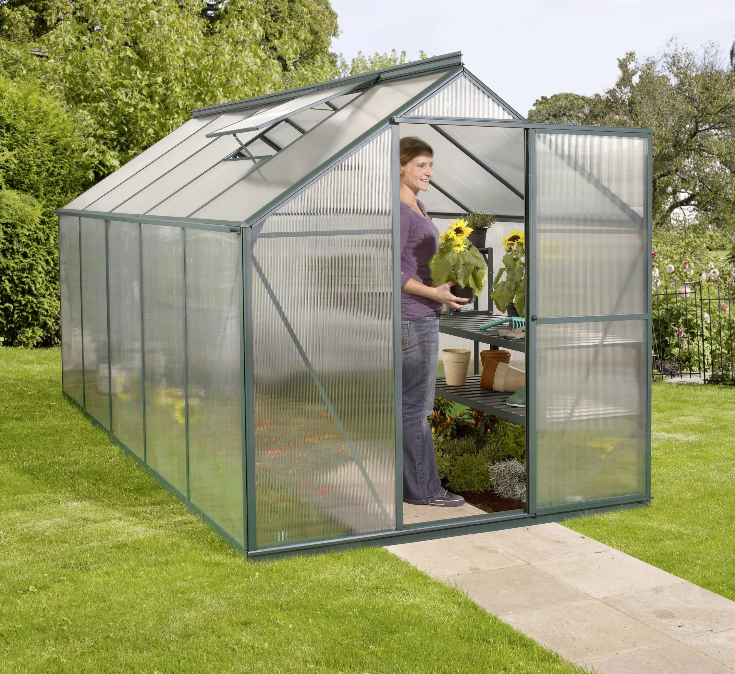 Funktional und formschön fügt sich dieses Gewächshaus perfekt in den Hobbygarten ein. Mit Grundflächen von 3,1 bis 7,5 m ² eignet sich das Eos nicht nur für Einsteiger in das Gewächshausgärtnern, sondern auch für Fortgeschrittene. Zum durchdachten Gesamtdesign zählen die konsequente Verglasung mit Hohlkammerplatten (HKP), die in zwei Stärken erhältlich ist, sowie die optisch ansprechenden, abgeflachten Designprofile: Durch diese hebt sich das Eos von den meisten am Markt erhältlichen Einsteigermodellen spätestens auf den zweiten Blick ab. Da die Platten in die Profile eingeschoben werden, sind sie komplett eingefasst. Das verschafft dem Eos einen Vorteil gegenüber Federklammermodellen in der Windstabilität – und in der Optik. Das Haus ist in vier Größen, von 3,1 bis 7,5 m², und in zwei Farben erhältlich: Aluminium eloxiert und Smaragd pulverbeschichtet. Die breiteren HKP-Felder, der insgesamt breitere Grundriss und eine Firsthöhe von über 2 m verleihen dem Eos einen großzügigen Look. Auch die 1,36 m hohe Traufe und die 1,64 m hohe Tür, selbst in der kleinsten Version, sind keine Selbstverständlichkeiten unter den Einsteigermodellen. Zusätzliche Features wie der wählbare Einsatz der Tür als Schwing- oder Schiebetür und der mitgelieferte Stahlfundamentrahmen komplettieren das Gesamtpaket des Einsteigermodells mit dem gewissen Extra.