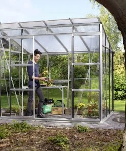 Mit diesem Gewächshaus setzen Sie architektonische Akzente in Ihrem Garten. Konzipiert mit einem Pultdach, breiter Front und hohen Seitenwänden besticht es durch ein großzügiges Design. Das leicht geneigte Dach lässt viel Sonne in das Gewächshaus. Der geringe Höhenunterschied des Pultdachs gewährleistet durchgehend eine angenehme Stehhöhe und bietet hochwachsenden Pflanzen genügend Raum sich frei zu entfalten. Die aufstellbaren Seitenfenster geben dem Haus wohnliches Flair. Die leichtgängige, breite Doppelschiebetür mit einer Breite von 122 cm und einer Höhe von 192 cm bietet großzügigen Zugang und eine zusätzliche Belüftungsmöglichkeit. Die Regenrinne und zwei Regenfallrohre (L 1,50 m, Ø 32 mm) gehören ebenfalls zur Standardausstattung. Das Gerüst besteht aus schmalen Aluminiumleisten. Da Aluminium ein extrem stabiles und widerstandsfähiges Material ist, genügen die feinen Leisten um langfristig für einen stabilen Stand zu sorgen. So ist Ihnen andauernde Freude an Ihrem Gewächshaus sicher gestellt.