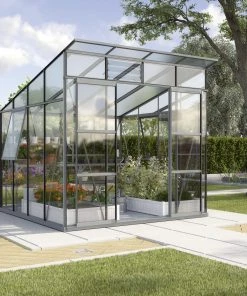 Mit diesem Gewächshaus setzen Sie architektonische Akzente in Ihrem Garten. Konzipiert mit einem Pultdach, breiter Front und hohen Seitenwänden besticht es durch ein großzügiges Design. Das leicht geneigte Dach lässt viel Sonne in das Gewächshaus. Der geringe Höhenunterschied des Pultdachs gewährleistet durchgehend eine angenehme Stehhöhe und bietet hochwachsenden Pflanzen genügend Raum sich frei zu entfalten. Die aufstellbaren Seitenfenster geben dem Haus wohnliches Flair. Die leichtgängige, breite Doppelschiebetür mit einer Breite von 122 cm und einer Höhe von 192 cm bietet großzügigen Zugang und eine zusätzliche Belüftungsmöglichkeit. Die Regenrinne und zwei Regenfallrohre (L 1,50 m, Ø 32 mm) gehören ebenfalls zur Standardausstattung. Das Gerüst besteht aus schmalen Aluminiumleisten. Da Aluminium ein extrem stabiles und widerstandsfähiges Material ist, genügen die feinen Leisten um langfristig für einen stabilen Stand zu sorgen. So ist Ihnen andauernde Freude an Ihrem Gewächshaus sicher gestellt.