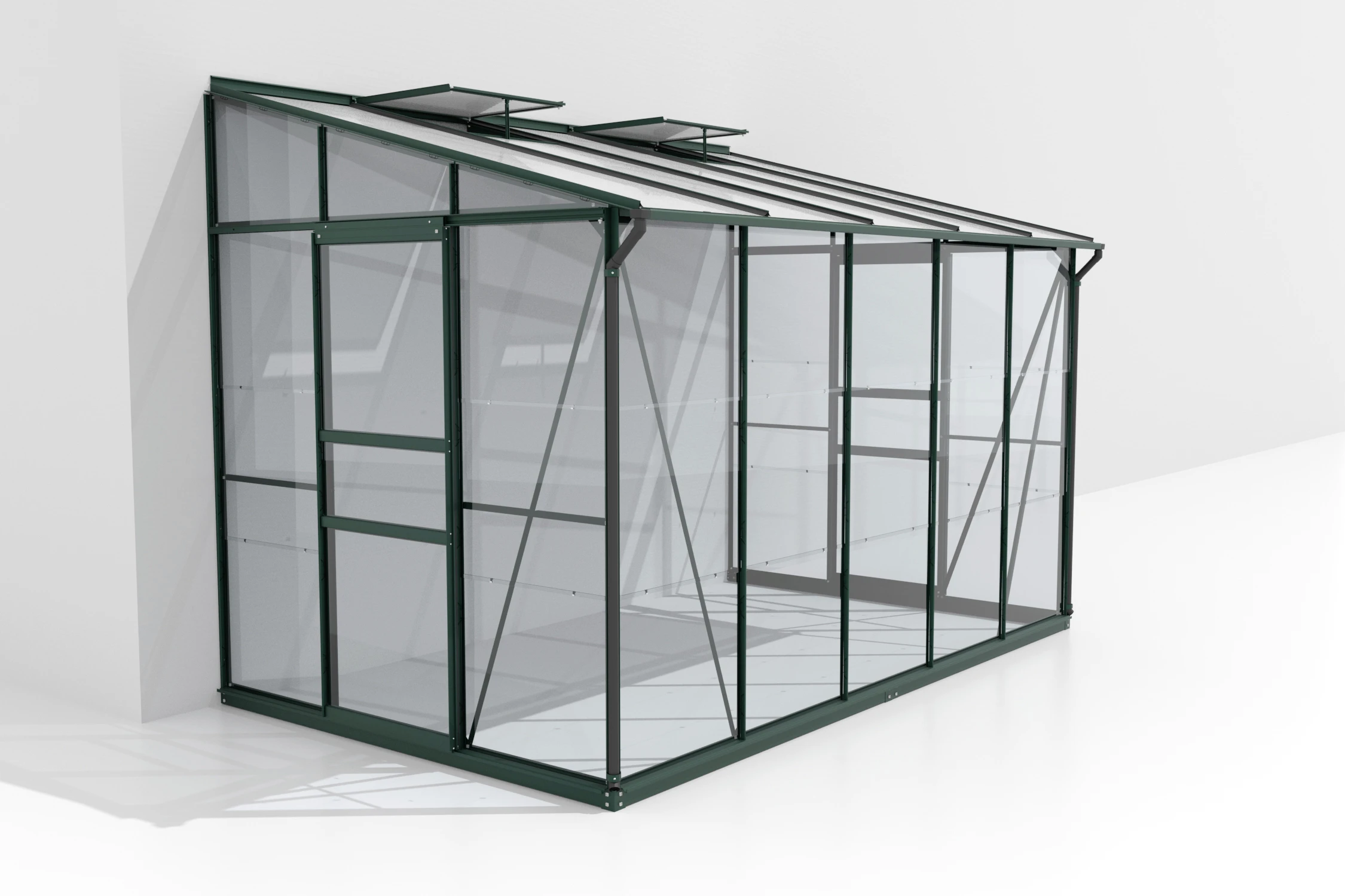 Schön hoch und mit breiten Doppelschiebetüren ausgestattet bietet das Anlehngewächshaus komfortable Rahmenbedingungen für das Hobbygärtnern. Insbesondere hoch wachsende Pflanzen finden unter dem 1,69 m bis 2,22 m hohen Pultdach genug Entfaltungsraum. Ein bis zwei Dachfenster schaffen in Kombination mit den Schiebetüren optimale Be- und Entlüftungsmöglichkeiten. Im Unterschied zum Balkonhaus gibt es noch mehr Verglasungsoptionen: HKP 4 und 6 mm sowie die Kombiverglasung mit HKP im Dach und schönem Sicherheitsglas, kristallklar (ESG) in den Seiten. Alle Styx und Osiris Modelle sind in Aluminium eloxiert, Anthrazit oder Smaragd pulverbeschichtet erhältlich. Passend zu allen Modellen ist ein 6 cm hoher Fundamentrahmen aus verzinktem, farbbeschichtetem Stahlblech als Zubehör lieferbar. Die Balkon- bzw. Anlehngewächshäuser der Serie Styx und Osiris können nicht freistehend aufgestellt werden! Eine Hauswand oder stabile Mauer als Rückwand ist notwendig.
