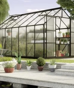 Freiraum zur Entfaltung: Hochwachsende Pflanzen wie auch große Gärtner haben an dem Uranus viel Freude, weil genug Platz für beide da ist. Ein Traum für alle Pflanzenliebhaber! Das Uranus ist ein Modell für den fortgeschrittenen Gärtner. Mit seiner außergewöhnlichen Firsthöhe von 246 cm und der Traufenhöhe von 151 cm bietet das Uranus auch hohen Pflanzen viel Raum. Das Modell hat ein kittloses Verglasungssystem mit rostfreien Glasfederklammern und eine leichtgängige, kugelgelagerte Doppelschiebetür mit einer Breite von 122 cm und einer Höhe von 191 cm.