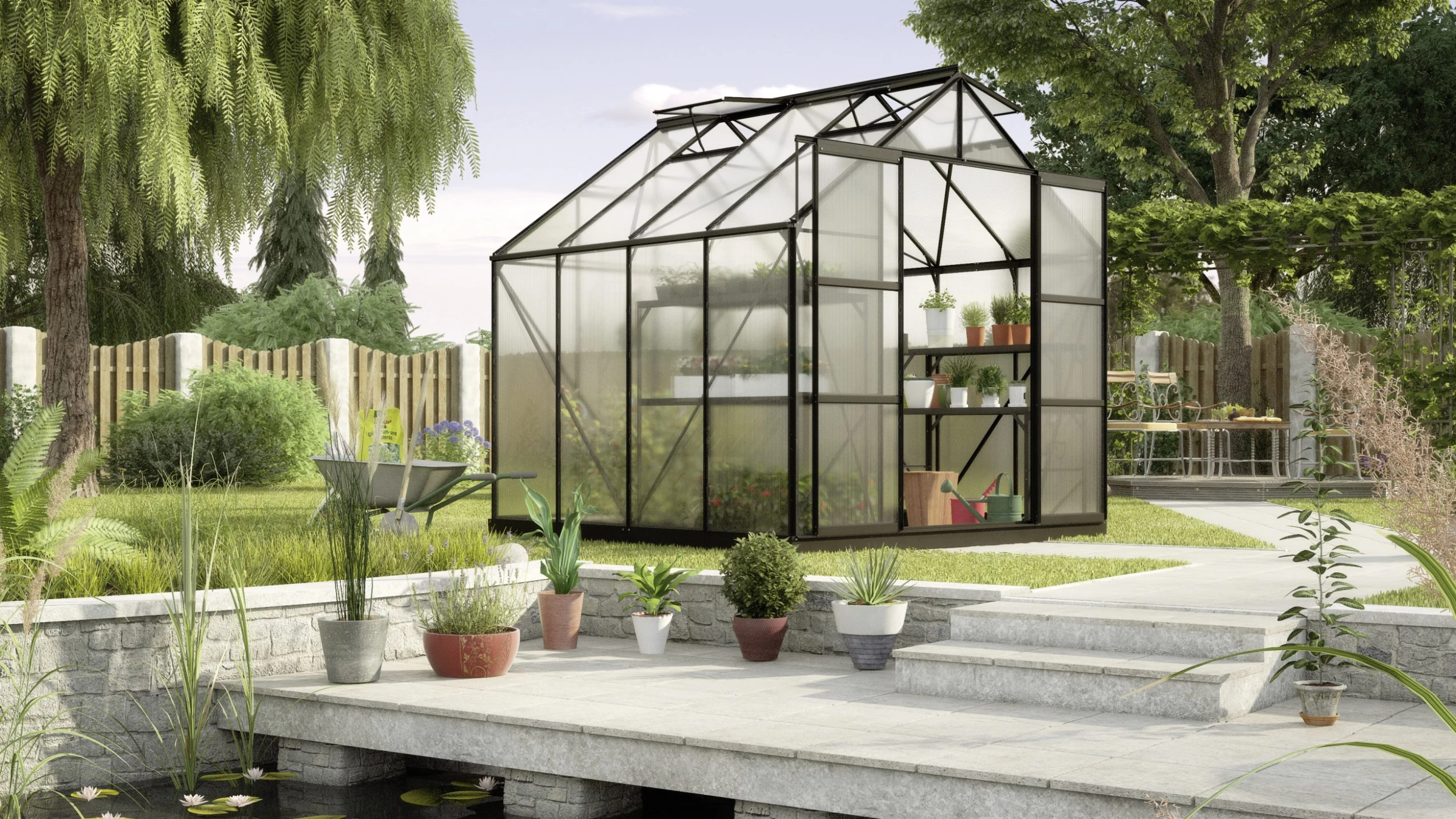 Freiraum zur Entfaltung: Hochwachsende Pflanzen wie auch große Gärtner haben an dem Uranus viel Freude, weil genug Platz für beide da ist. Ein Traum für alle Pflanzenliebhaber! Das Uranus ist ein Modell für den fortgeschrittenen Gärtner. Mit seiner außergewöhnlichen Firsthöhe von 246 cm und der Traufenhöhe von 151 cm bietet das Uranus auch hohen Pflanzen viel Raum. Das Modell hat ein kittloses Verglasungssystem mit rostfreien Glasfederklammern und eine leichtgängige, kugelgelagerte Doppelschiebetür mit einer Breite von 122 cm und einer Höhe von 191 cm.