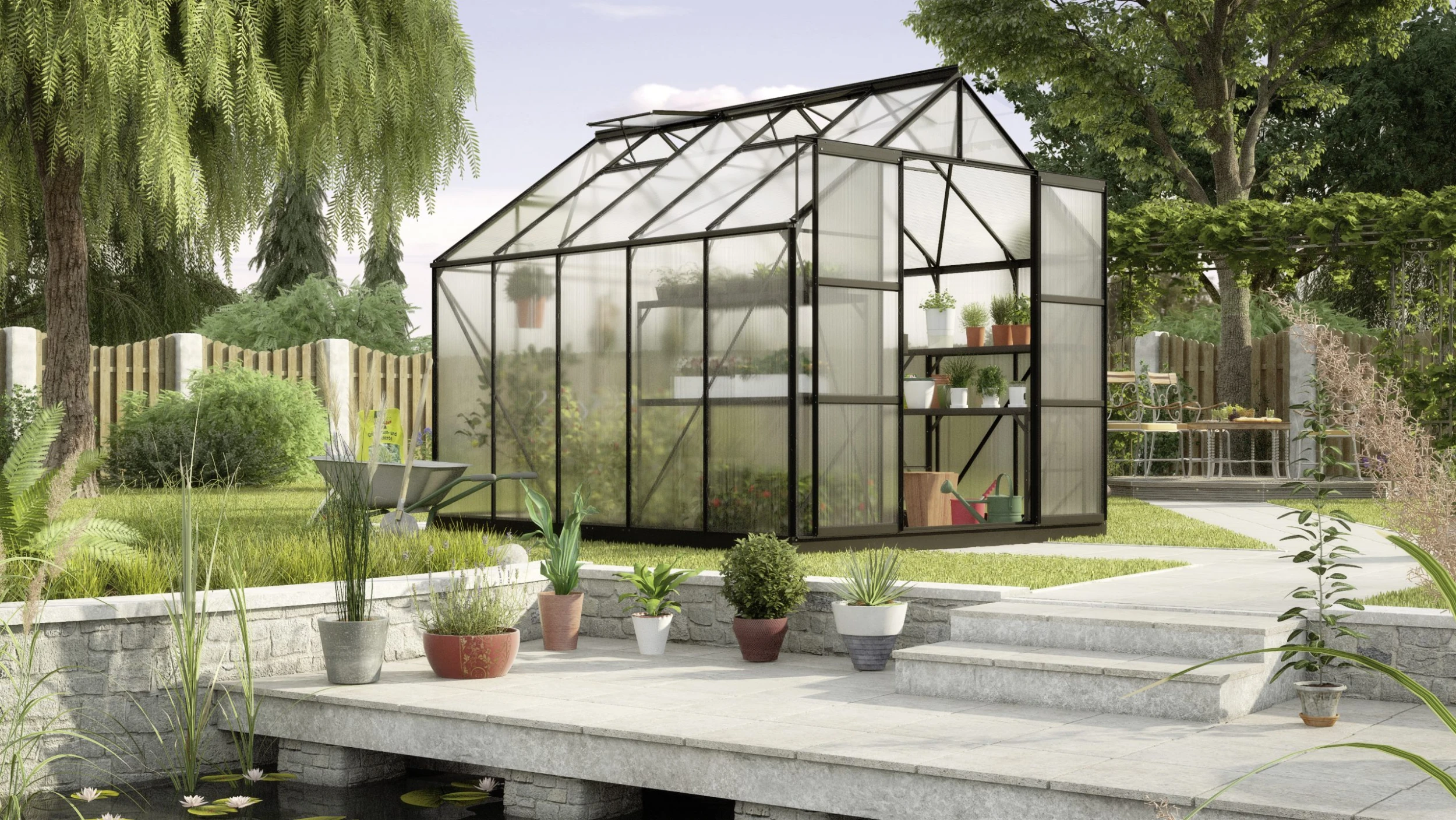 Freiraum zur Entfaltung: Hochwachsende Pflanzen wie auch große Gärtner haben an dem Uranus viel Freude, weil genug Platz für beide da ist. Ein Traum für alle Pflanzenliebhaber! Das Uranus ist ein Modell für den fortgeschrittenen Gärtner. Mit seiner außergewöhnlichen Firsthöhe von 246 cm und der Traufenhöhe von 151 cm bietet das Uranus auch hohen Pflanzen viel Raum. Das Modell hat ein kittloses Verglasungssystem mit rostfreien Glasfederklammern und eine leichtgängige, kugelgelagerte Doppelschiebetür mit einer Breite von 122 cm und einer Höhe von 191 cm.