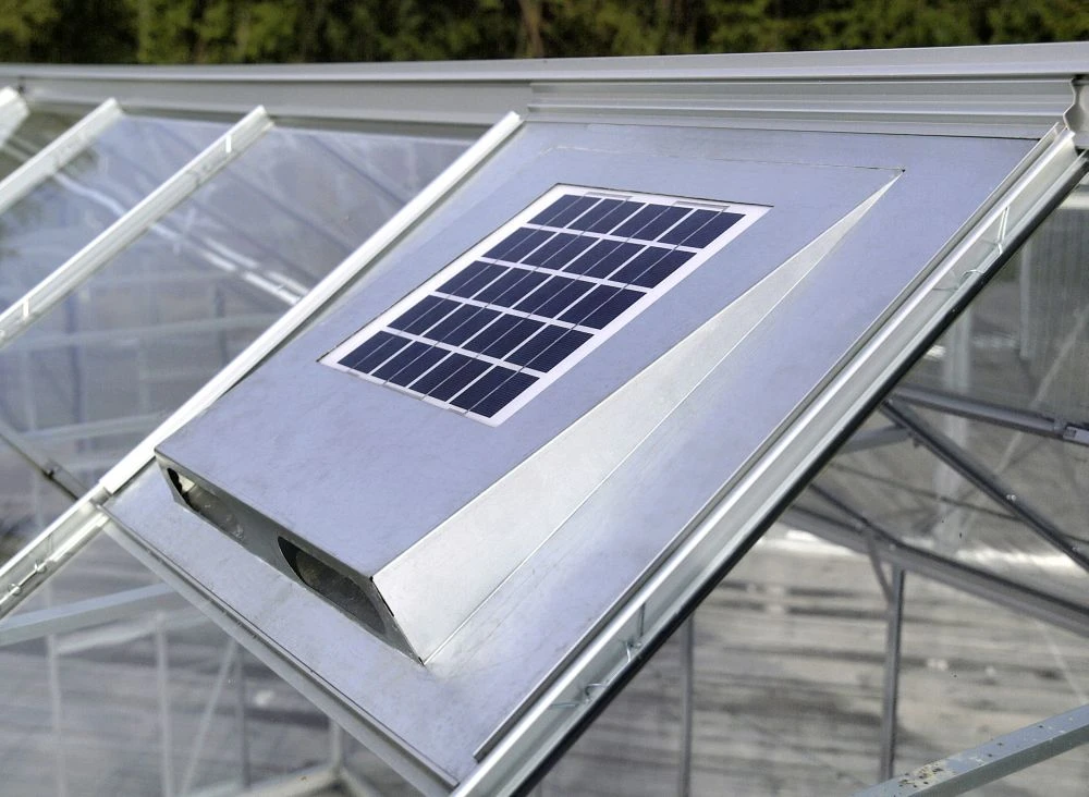 Der Solarlüfter wälzt bis zu 135 m³ Luft in der Stunde um und kann so die Luft in einem 10 m² großen Gewächshaus drei bis vier Male am Tag ersetzten. Dabei wird auch feuchte Luft abtransportiert, so dass nicht nur die Innentemperatur, sondern auch die Kondensation effektiv gesenkt wird. Mit dem einfach zu bedienenden Ein- und Ausschalter kann der Ventilator jederzeit unterbrochen werden. In fünf Größen erhältlich, passt der Solarfan in nahezu jedes Gewächshaus, unabhängig vom Hersteller. Der Dachventilator wird einfach anstelle von Glas in einem der Dachfenster montiert.